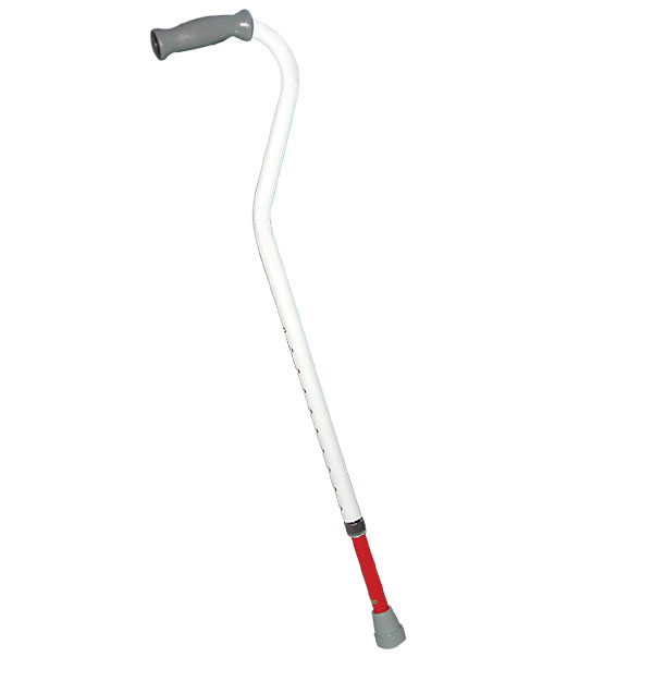(Non Folding) Heavy gauge anodized aluminum tube. White shaft. Red bottom section. Heavy duty rubber tip. Adjusts 29" – 38"H. Offset handle.