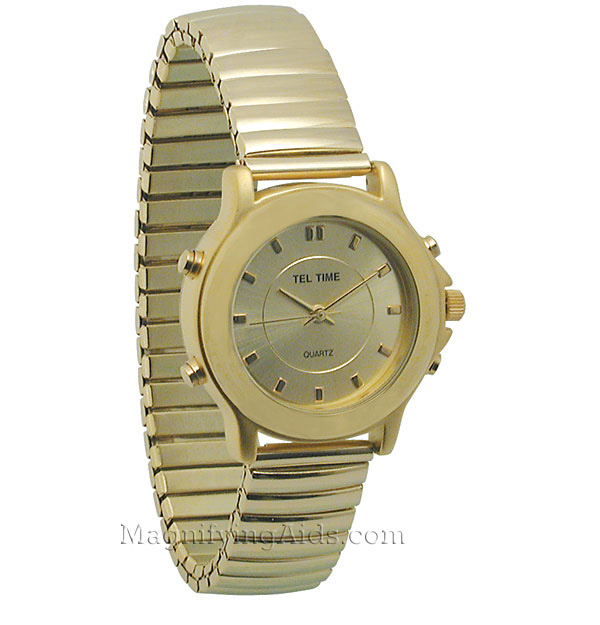 This beautifully designed Ladies Golden Quartz Analog Talking Watch has a time and alarm announcement with a clear, male voice. Golden case with golden dial and golden hands. Golden expansion band. Modern watch design. Features: hourly audio announcement and alarm with three different sounds. Watch Face Size: 1 Inch.