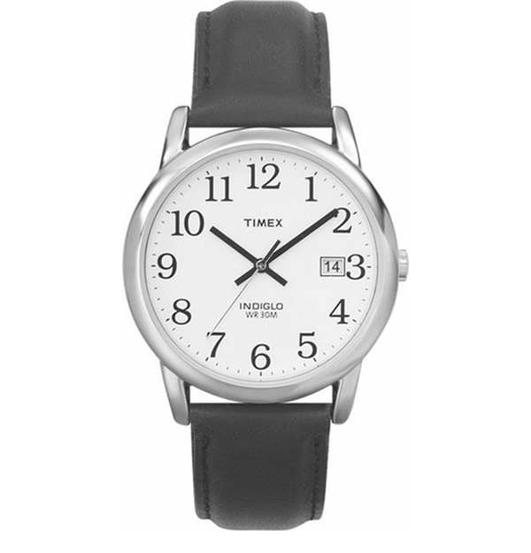 The Men's Easy Reader Black Leather Strap Chrome-Tone Case Watch by Timex is for the guy whose style sense is understated yet classic. While the watch doesn't feature all the bells and whistles, don't underestimate its simplicity for lack of functionality. The metal Chrome-tone case contrasts the rich, durable black leather strap. The pristine white dial has bold, black, easy-to-read numerals and slender black baton-style hands and sweeping seconds hand. There is a calendar at the three o'clock position, and the watch is water resistant to 30 meters. Dial measures 1.5" in diameter.